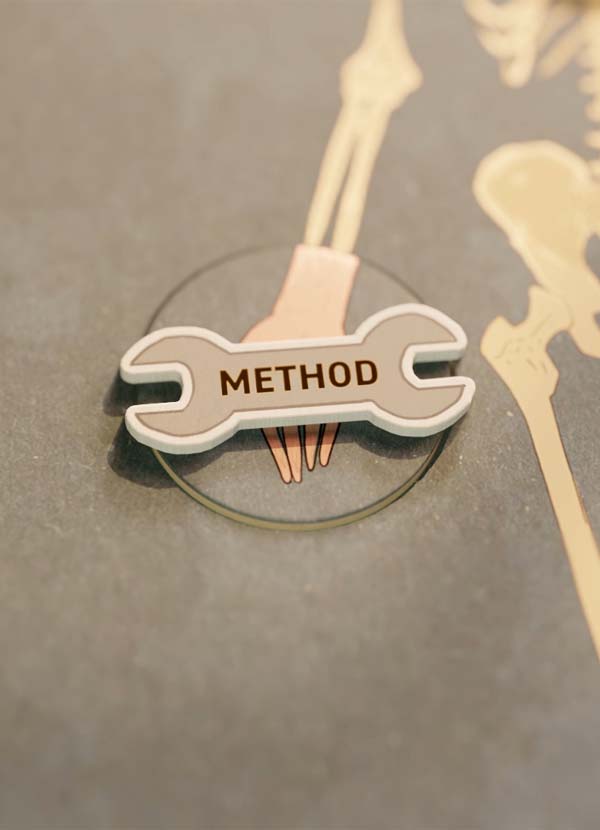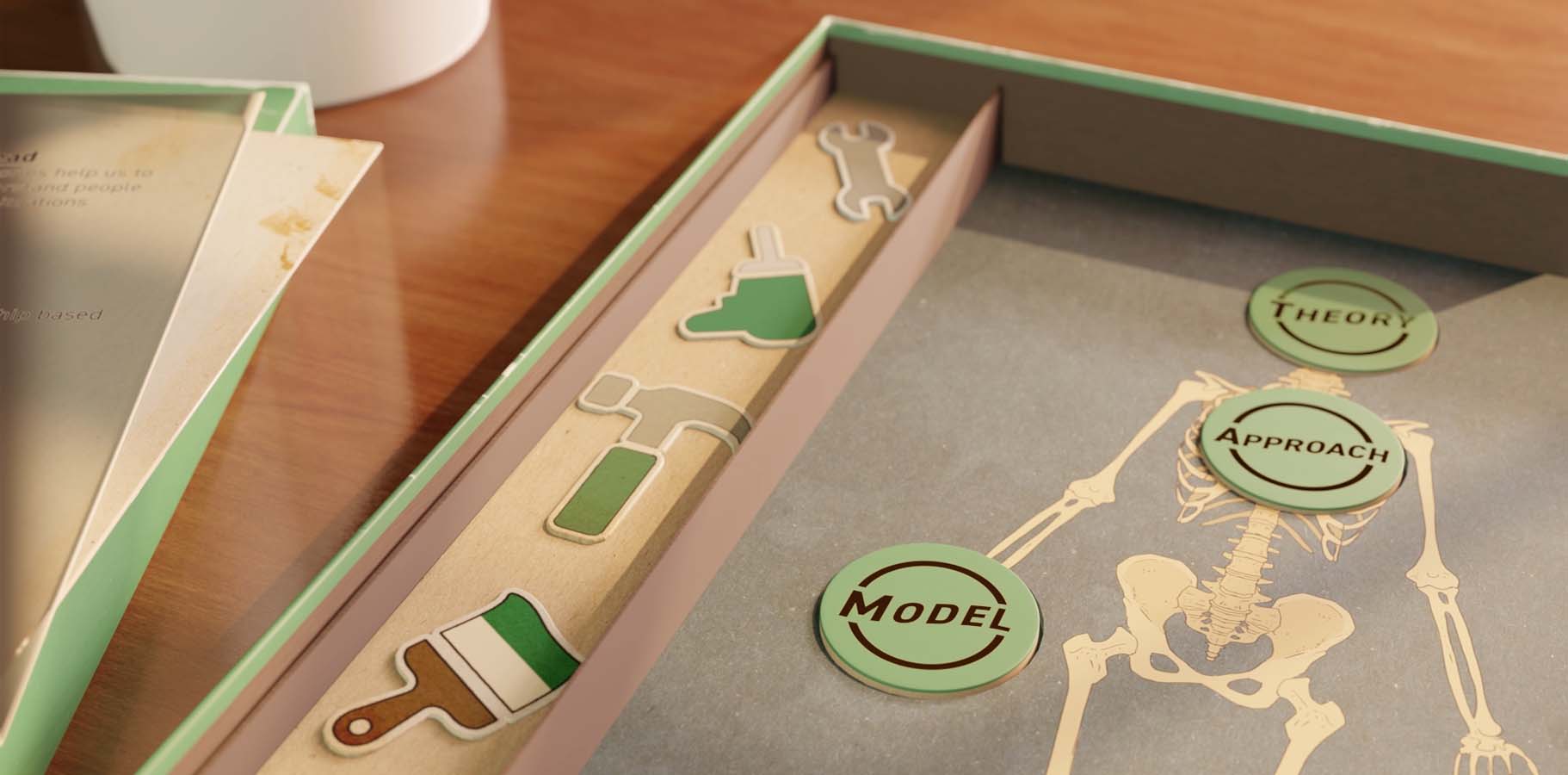 Tokens labelled Theory, Model and Approach could be flipped to reveal the appropriate element, while Method was represented as a tool. Different tools were placed on the hand (the model), then carefully returned to their slots — reinforcing the idea of knowing when, and how, to use the right tools in practice.