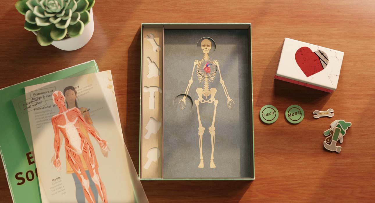 The animation was built around a custom-designed game board featuring a skeleton — representing the practitioner — with interchangeable components linked to head, heart and hands, a core concept in social pedagogy.